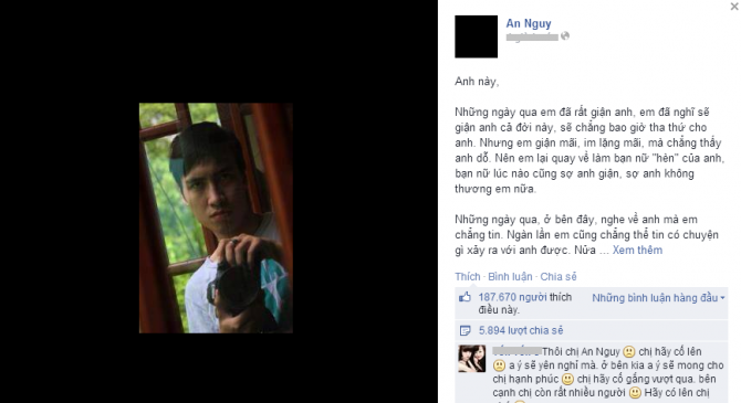 Ngay lập tức, An Nguy đã nhận được rất nhiều lời động viên chân thành từ bạn bè và cộng đồng mạng. Mọi người đều mong muốn cô cố gắng vượt quá nỗi đau quá lớn này để tiếp tục với cuộc sống mới với những điều tốt đẹp hơn.