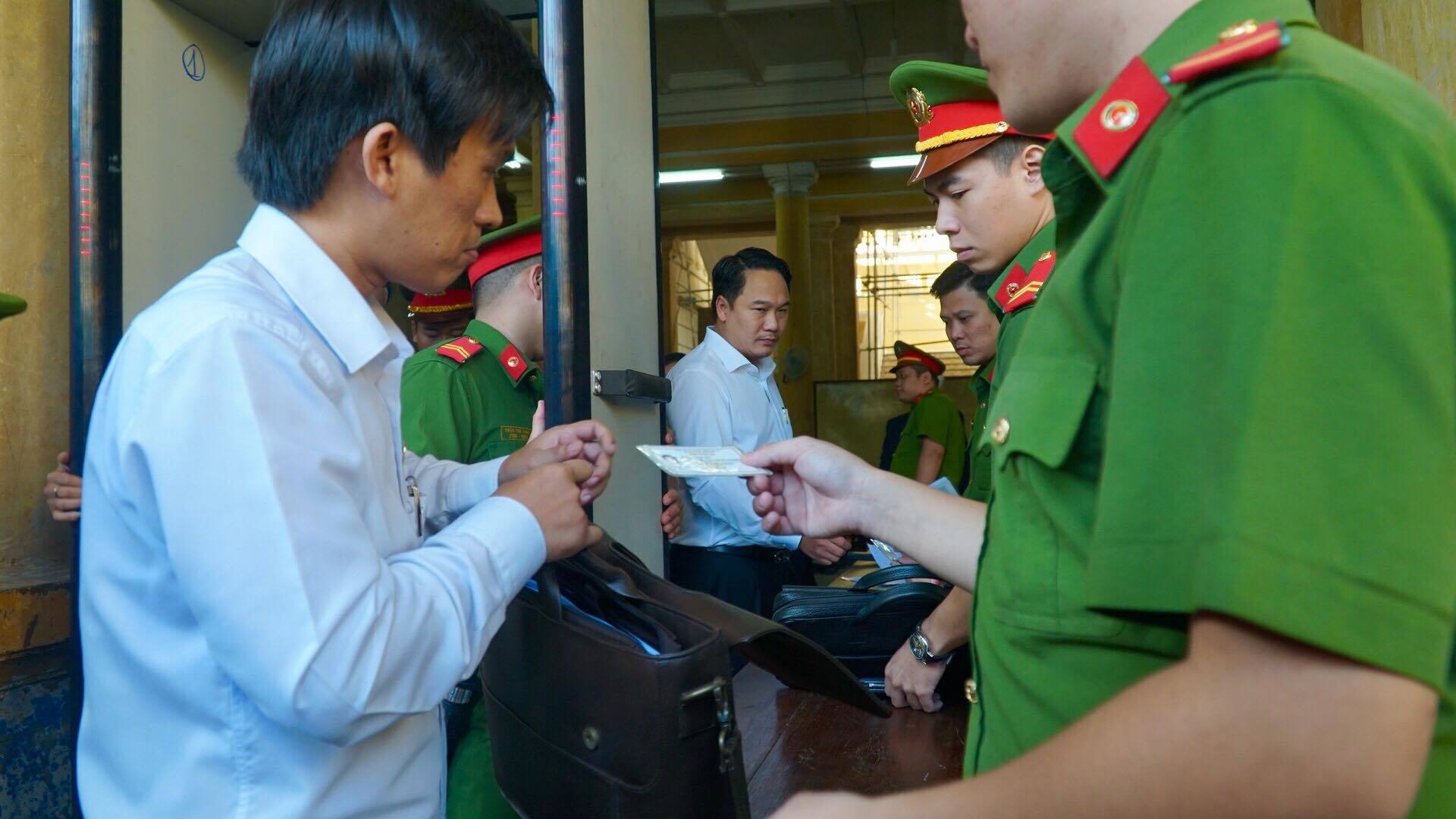 Những người đến tham dự phiên tòa phải xuất trình giấy tờ với cảnh sát, sau đó phải qua một lớp kiểm soát an ninh để vào trong.
