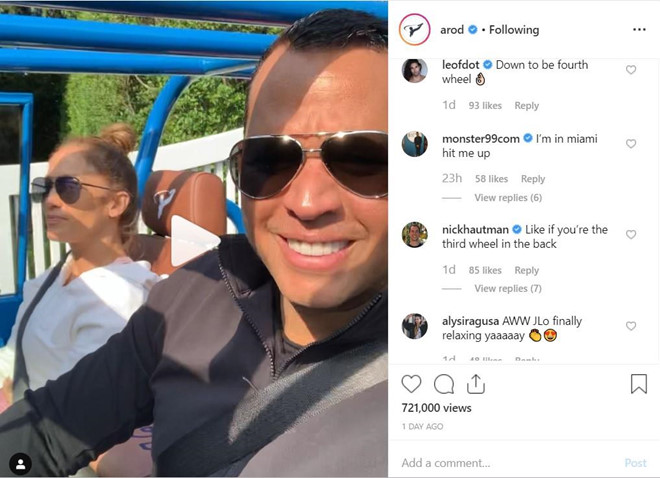 Hôm 15/8, trên Instagram, cầu thủ bóng chày Alex Rodriguez đã khoe ảnh chiếc xe hơi mới do bạn gái tặng, kèm lời chú thích: "Một ngày thật tuyệt. Cảm ơn em về món quà ý nghĩa này". Trong bức ảnh cô nàng Jennifer Lopez đang ngồi kế bên.