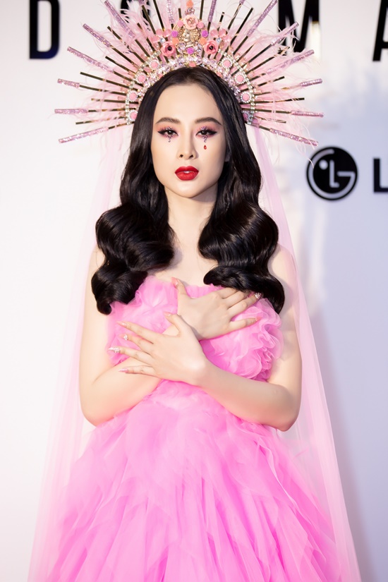 Angela Phương Trinh tạo nên sự đồng bộ với đôi mắt màu hồng điểm xuyết những viên đá lấp lánh. Mái tóc gợi sóng cùng đôi môi đỏ mọng càng giúp nữ diễn viên ghi điểm bởi sự quyến rũ pha lẫn ngọt ngào. |