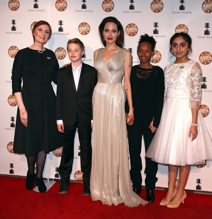 Tại Lễ trai giải, nữ diễn viên 42 tuổi kiêm nhà sản xuất đi cùng 2 con là Shiloh, 11 tuổi, và Zahara, 13 tuổi.