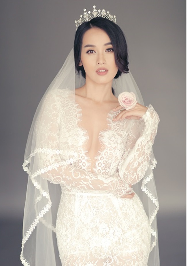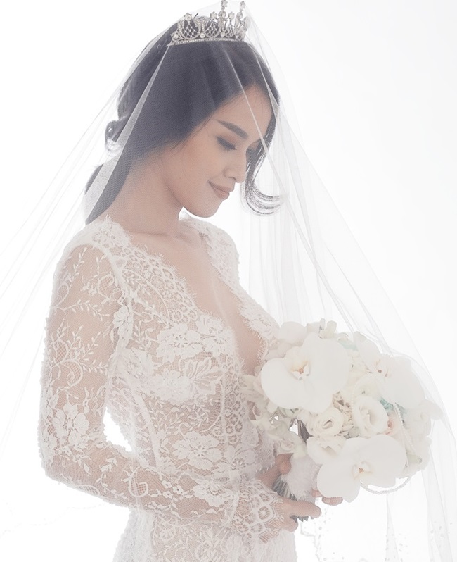 Cô dâu Tú Vi xinh đẹp, rạng ngời trong bộ váy cưới ren trắng vô cùng gợi cảm. |