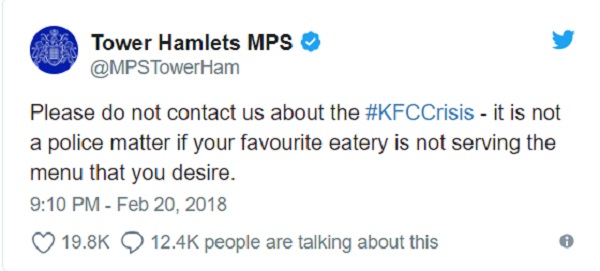 Thông báo của sở cảnh sát London trên Twitter mong người dân đừng gọi điện nếu không được ăn món gà yêu thích. - Ảnh: Twitter |