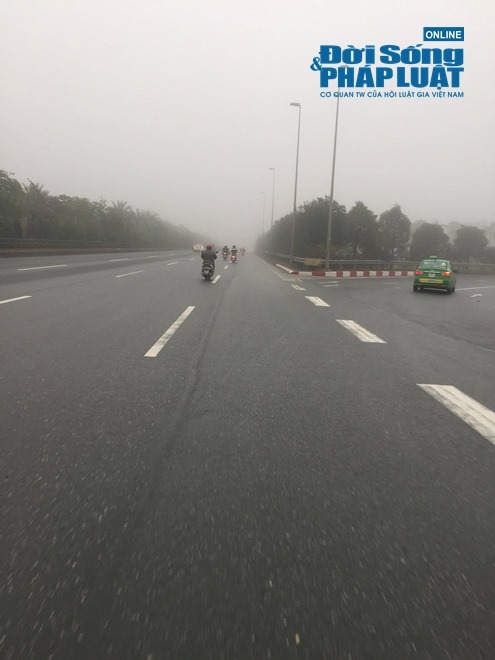 Cung đường Võ Nguyên Giáp cũng bị bao phủ trong lớp sương mù dày, tầm nhìn của người tham gia giao thông bị hạn chế dưới 1km. |