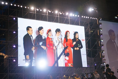 Choáng ngợp trên thảm đỏ LHP Busan là hình ảnh “tứ đại mỹ nhân” của Cô Ba Sài Gòn diện áo dài tự tin sải bước trước ống kính phóng viên bên cạnh đạo diễn Trần Bửu Lộc và Kay Nguyễn.