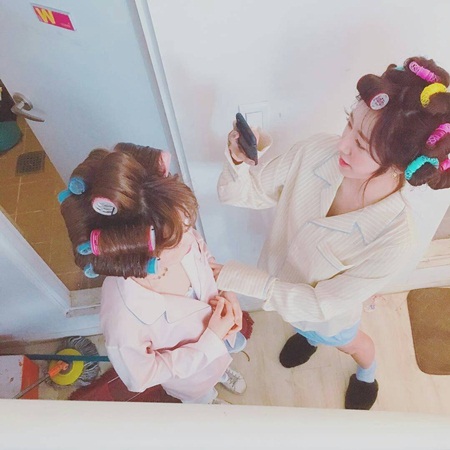 Có vẻ Apink có thói quen chia sẻ hình ảnh mái tóc vẫn đang dang dở khi quấn lô. Khác với những hình ảnh lộng lẫy khi biểu diễn, trông cả Bomi và Namjoo đều thật dễ thương khi rời xa ánh đèn sân khấu.