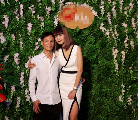 | Tuyển thủ Than Quảng Ninh Mạc Hồng Quân tháp tùng vợ - người đẹp Kỳ Hân đến tham dự buổi khai trương nhà hàng của Hạ Vy. |