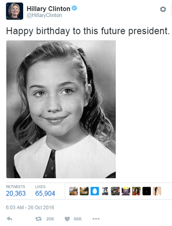 (ĐSPL) – Hôm 26/10, Hillary Clinton đã viết chúc mừng sinh nhật mình trên Twitter cá nhân và tự gọi là "tổng thống tương lai".