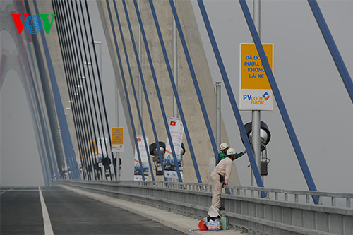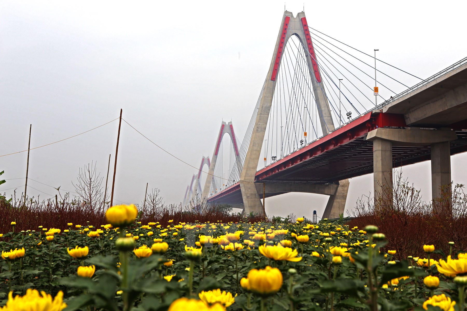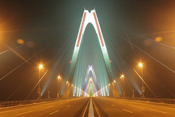 Cầu Nhật Tân là cây cầu có số nhịp dây văng liên tục lớn nhất thế giới. Phần cầu chính áp dụng công nghệ tiên tiến nhất, lần đầu tiên được áp dụng tại Việt Nam. (Ảnh: Trọng Đạt/TTXVN) |