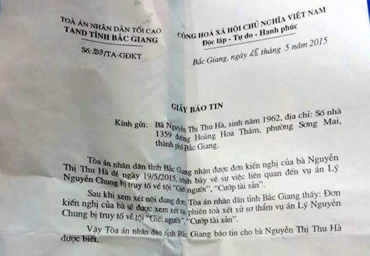 Giấy mời của TAND tỉnh Bắc Giang tới bà Hà với tư cách là nhân chứng |