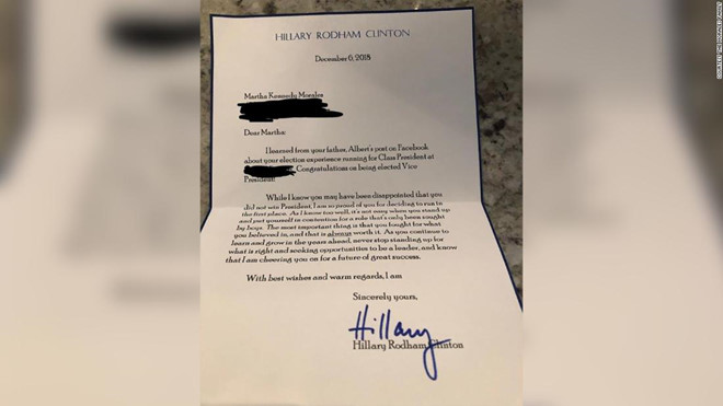 Trong bức thư, bà Clinton còn viết: "Điều quan trọng nhất là cháu đã chiến đấu cho những gì cháu tin tưởng, và điều này luôn xứng đáng. Khi cháu tiếp tục học hỏi và trưởng thành trong những năm tới, đừng bao giờ ngại đứng lên vì lẽ phải và tìm kiếm cơ hội để trở thành người lãnh đạo. Mong cháu biết rằng bác luôn cổ vũ cháu vì một tương lai thành công rực rỡ".