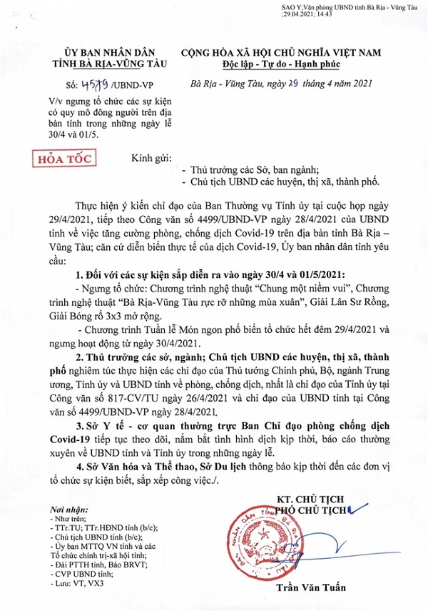 Chiều ngày 29/4, UBND tỉnh Bà Rịa - Vũng Tàu có công văn hỏa tốc liên quan đến việc ngưng tổ chức các sự kiện có quy mô đông người trên địa bàn tỉnh trong những ngày lễ 30/4 và 1/5 ngay sau khi một số tỉnh thành ghi nhận các ca dương tính SARS-CoV-2 ngoài cộng đồng.