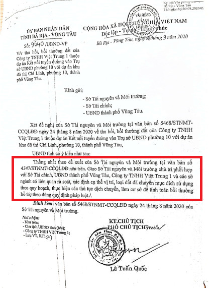 Đến ngày 08/9/2020, ông Lê Tuấn Quốc - Phó Chủ tịch UBND tỉnh Bà Rịa – Vũng Tàu ký Văn bản 9640/UBND-VP với nội dung thống nhất đề xuất của Sở TN&MT; Giao Sở TN&MT chủ trì phối hợp với Sở Tài chính, UBND TP Vũng Tàu, Công ty Việt Trung 1 và các sở, ngành có liên quan rà soát, xác định cụ thể vị trí, loại đất đã chuyển mục đích sử dụng theo quy hoạch. Thực hiện các thủ tục dịch chuyển, làm cơ sở để tính toán bồi thường hỗ trợ theo quy định của pháp luật.