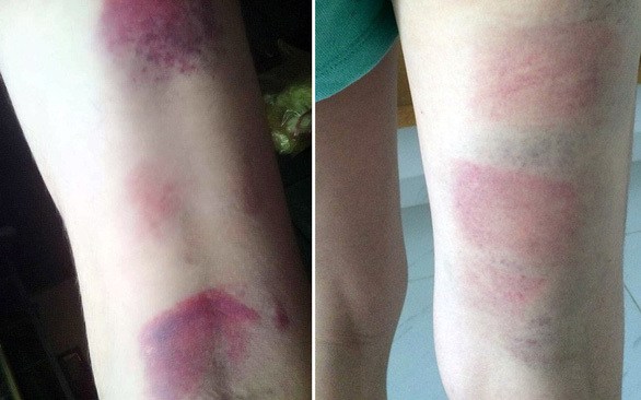 Học sinh bị cô giáo dùng thước đánh tím chân. Ảnh: Phụ huynh cung cấp |