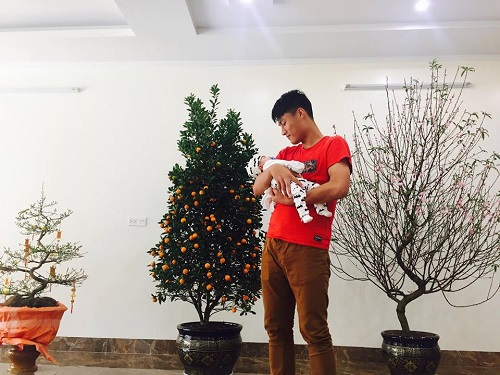 Tiền vệ Than Quảng Ninh bế con trai. |