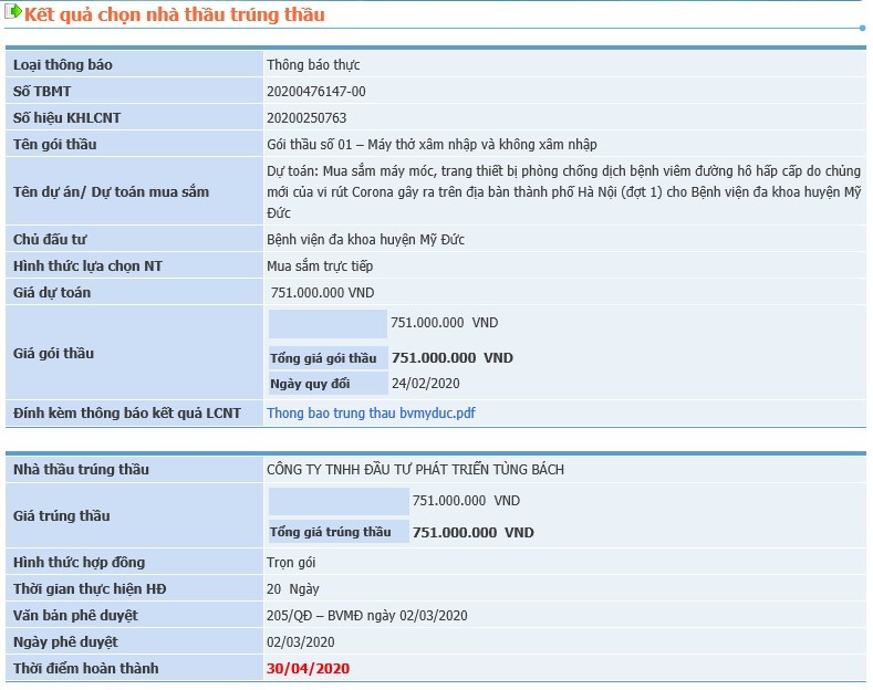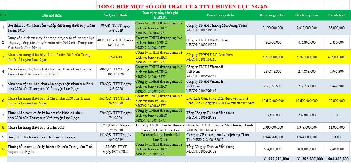 Tính đến tháng 7/2020, TTYT huyện Lục Ngạn đã thực hiện mời thầu 23 gói với số tiền chi ngân sách lên đến hàng chục tỷ đồng. Hầu hết những gói thầu này đều có giá trúng rất sát với giá dự toán. Thậm chí, có những gói, giá bỏ thầu bằng luôn giá mời thầu.
