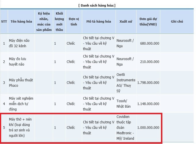Một số hạng mục thiết bị của gói thầu này cũng có giá quá cao. Đơn cử, máy thở model e360C/e360E, Covidien của hãng Medtronic – Mỹ, xuất xứ Ireland, sản xuất từ năm 2019 trở đi (kèm máy nén khí), Bệnh viện đa khoa huyện Mỹ Đức mua với giá 751 triệu đồng, nhưng TTYT huyện Sơn Động lại mua đến 1 tỷ đồng.