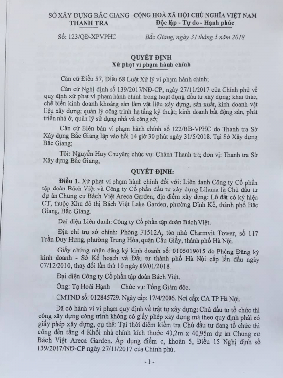 Ngày 31/5/2018, Thanh tra Sở Xây dựng Bắc Giang ban hành Quyết định số 123/QĐ-XPVPHC về việc xử phạt hành chính đối với Liên danh Cty CP Tập đoàn Bách Việt và Cty CP đầu tư xây dựng Lilama là Chủ đầu tư Dự án Chung cư Bách Việt Areca Garden, mức phạt 40.000.000 đồng; yêu cầu Chủ đầu tư dừng ngay việc thi công công trình vi phạm, trong quá trình dừng thi công phải đảm bảo an toàn cho người và các phương tiện bên trong và quanh khu vực thi công.