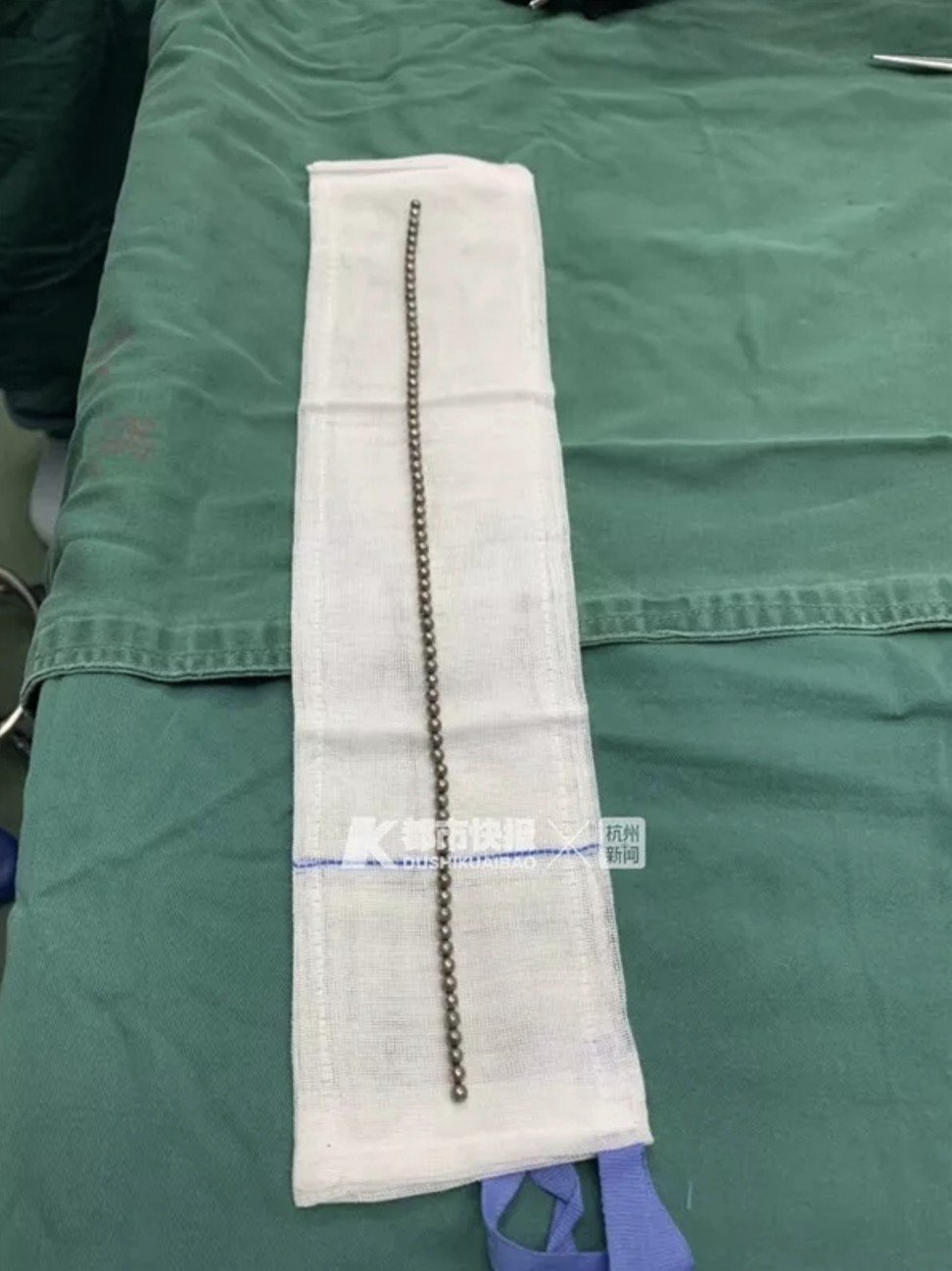 Bác sĩ phẫu thuật cho biết những quả bóng cuối kết thành chuỗi dài nên dễ kéo ra - Ảnh: Guancha. |