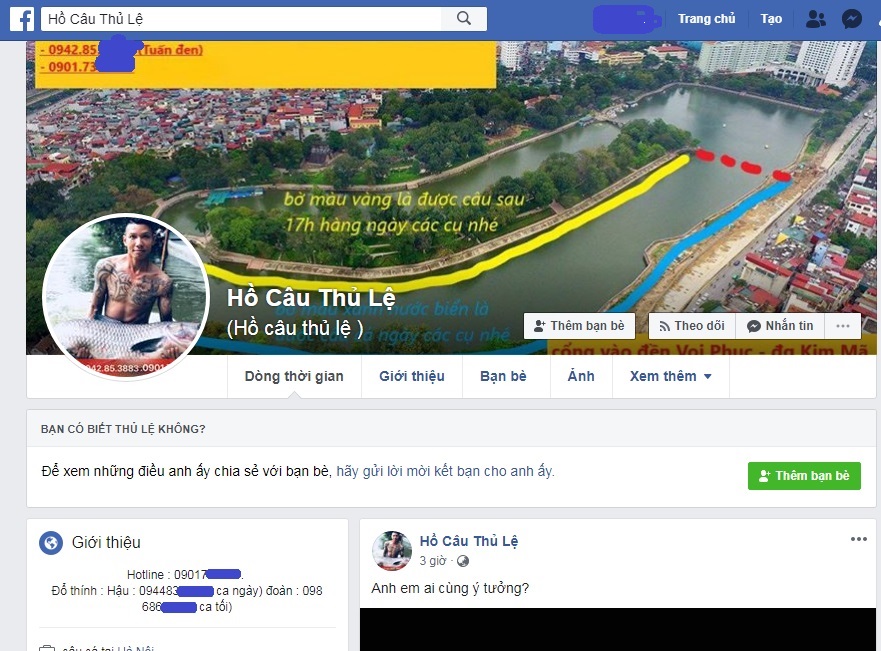 Còn đối với những cần thủ mới, nếu không có số điện thoại của chủ hồ thì có thể truy cập vào trang facebook Hồ Câu Thủ Lệ. Bởi ngay trên avatar của trang này là chính là hình ảnh sơ đồ hồ công viên Thủ Lệ và số điện thoại “đường dây nóng” do một người đàn ông tên “Tuấn đen” phụ trách để cho cần thủ liên hệ.