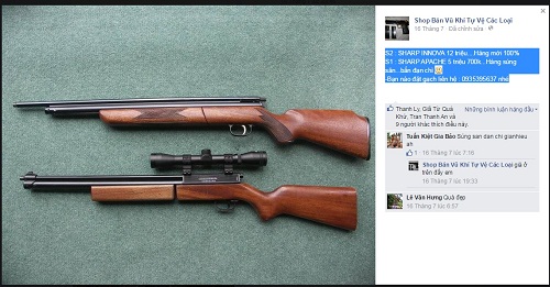 Điển hình như hiện nay, N. đang có các loại hàng như: Súng săn Tiệp Slavia Binka “dành cho anh em nào mê săn bắn” với giá 19 triệu đồng. N. cho biết, đây là sản phẩm có lực nén hơi 9kg, sử dụng đạn mũi dù, tầm bắn chính xác là 30m, có cân nặng 3,1kg”.