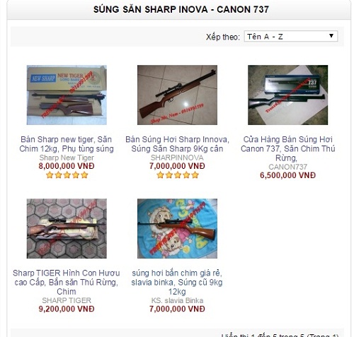 Ngoài ra còn rất nhiều mặt hàng khác cũng được rao đầy rẫy trên các trang mạng. Điển hình như Sharp Innova có giá 12 triệu đồng... Hàng quảng cáo là “mới 100\%”. Rồi “Sharp Apache có giá 5,7 triệu đồng, bắn đạn chì”, người tên L. có số điện thoại 0935395xxx rao. Hay như súng CP99 Compact Co2 có giá 6 triệu đồng...