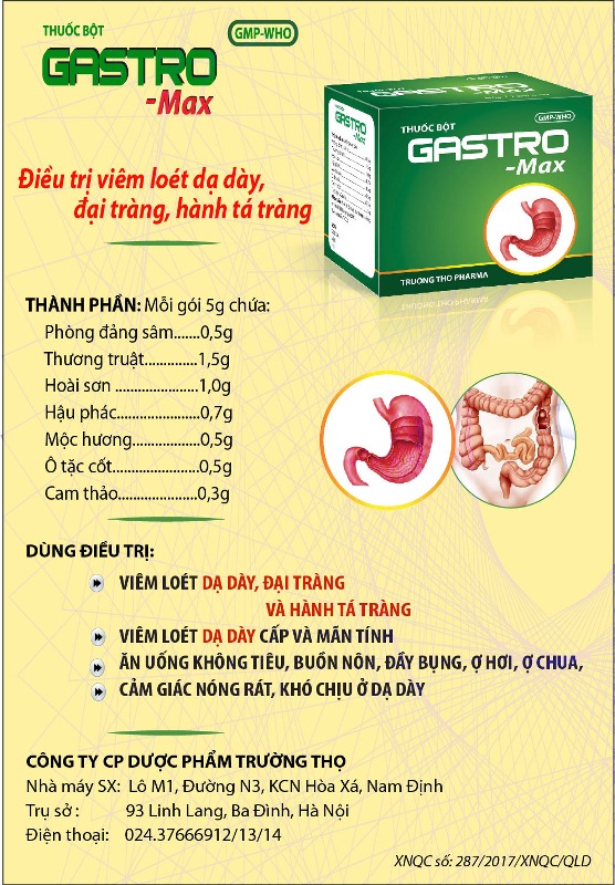 Gastromax với cơ chế điều trị tấn công và bao vây, chỉ định trong các trường hợp viêm loét dạ dày, đại tràng và hành tá tràng; viêm loét dạ dày cấp và mãn tính; ăn không tiêu, buồn nôn, đầy bụng, ợ hơi, ợ chua, cảm giác nóng rát, khó chịu ở dạ dày; bệnh trĩ nội. Thêm nữa, Gastromax với dạng thuốc bột, dễ tan trong nước và dễ hấp thụ, được chia thành các gói nhỏ đặc biệt thuận tiện và hiệu quả cho người mắc bệnh lý về dạ dày, đại tràng và hành tá tràng.