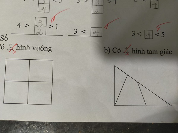 Đáp án này đã bị cô giáo gạch sai, và sửa thành 5 hình vuông (4 hình vuông nhỏ và 1 hình vuông bao quanh), 3 hình tam giác (3 hình bên trong và 1 hình bao ngoài. Đa số đều cho rằng cô giáo đã chấm đúng nhưng lời giải thích của bé lớp 1 trong trường hợp này lại khiến tất cả phải 'gãi đầu' vì khá hợp lý.