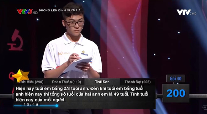 Tại cuộc thi, trong 15 giây suy nghĩ, thí sinh Thái Sơn không đưa ra được đáp án cho câu hỏi tính số tuổi trên. Ba bạn chơi của nam sinh cũng không nhấn chuông giành quyền trả lời.