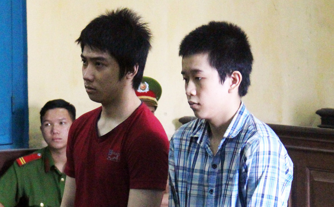 Bị cáo Trần Điền Duy (áo đỏ) và Lê Ngọc Hưng tại phiên tòa phúc thẩm. |