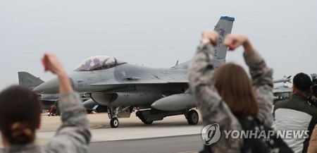Máy bay F-16 của Không quân Mỹ cất cánh tại Kunsan Air Base, Hàn Quốc tham gia cuộc tập trận ngày 20/4/2017 (Ảnh: Yonhap). |