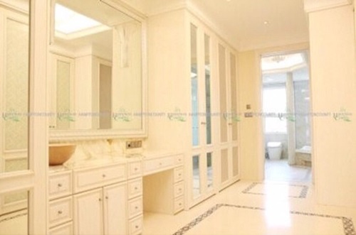 Phòng trang điểm rộng với chiếc tủ 4 buồng chỉ dành cho quần áo và giày dép.