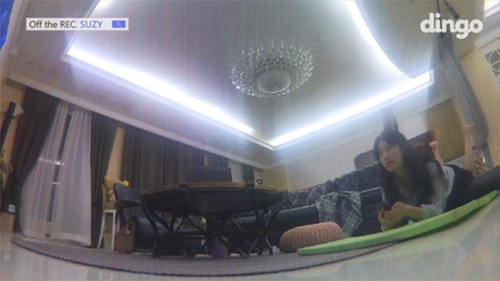 Phòng khách với hướng nhìn lên trần nhà, khoe chiếc đèn treo sang trọng. Tức góc độ khác có thể thấy được phòng khách của Suzy rất rộng, bên phải là phòng ăn.