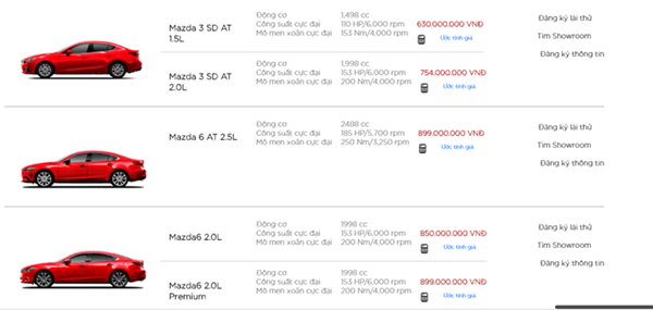 Trong tháng 10 này, hãng Mazda đưa ra các chương trình giảm giá cho nhiều dòng xe. Cụ thể, Mazda 6, với mức giảm từ 45-106 triệu đồng cho cả 3 phiên bản. Giá của Mazda 6 2017 2.0L, Mazda 6 2017 2.0L Premium, Mazda6 2017 2.5L Premium lần lượt là 850 triệu đồng, 899 triệu đồng và 999 triệu đồng.