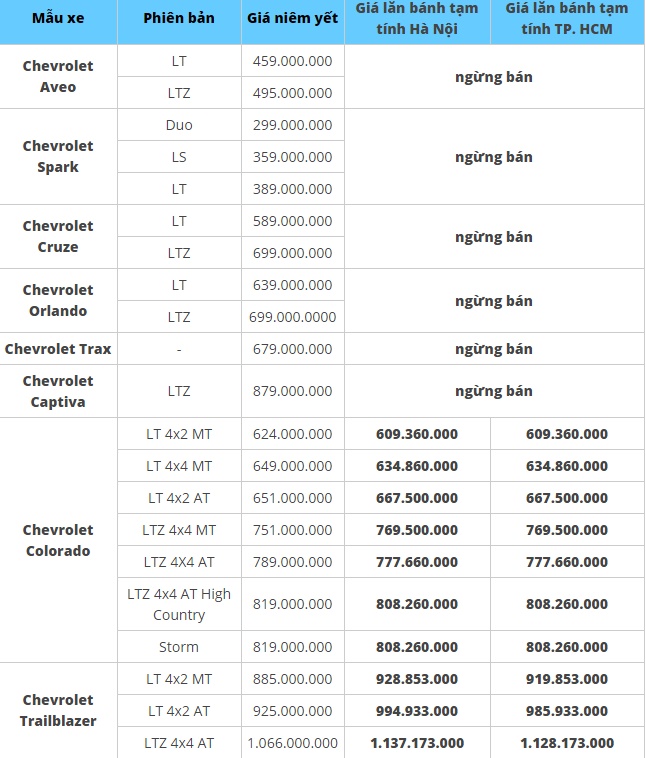 Dưới đây là bảng giá Chevrolet cập nhật mới nhất: