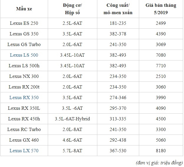 Bảng giá Lexus tháng 5/2019 mới nhất. Ảnh: Thethao247 |