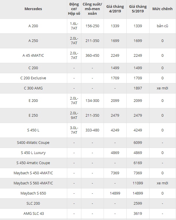 Bảng giá Mercedes-Benz mới nhất tháng 5/2019 tại thị trường Việt Nam. Cập nhật thông tin giá các mẫu Mercedes-Benz tháng 5/2019 nhanh và chính xác nhất.