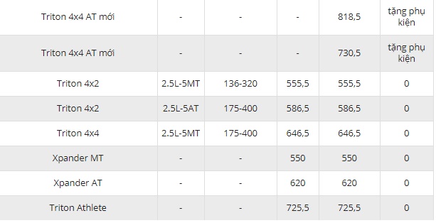 Dưới đây là bảng giá Mitsubishi cập nhật mới nhất: