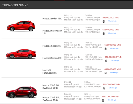 Bảng giá cụ thể các mẫu ô tô Mazda trong tháng 3/2018 tại thị trường Việt Nam: