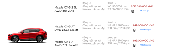 Mẫu xe có lượng tiêu thụ tốt như Mazda CX-5 cũng tăng từ 20 – 30 triệu đồng tùy từng phiên bản. Hiện giá bán CX-5 bản 2.0L 2WD tăng thêm 30 triệu đồng (giá bán mới 899 triệu đồng), CX-5 2.5L AWD tăng 20 triệu đồng (giá bán mới 1,019 tỷ đồng) và CX-5 2WD tăng 30 triệu đồng với (giá hiện tại là 999 triệu đồng).