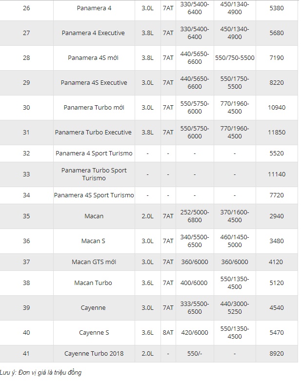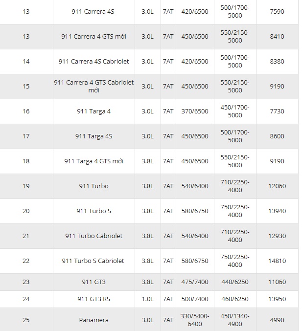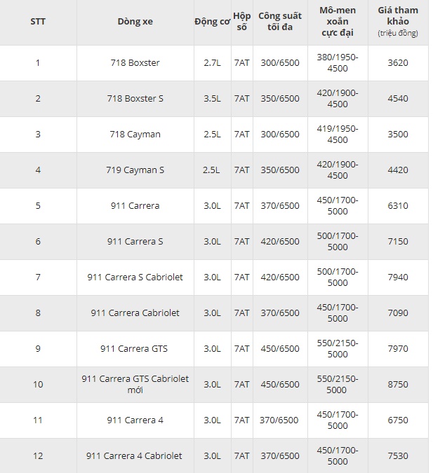 Dưới đây là bảng giá Porsche cập nhật mới nhất: