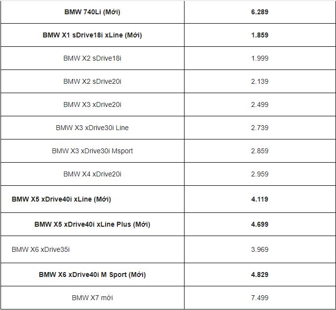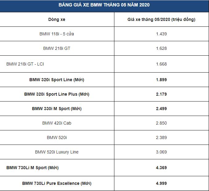 Bảng giá các mẫu xe BMW tháng 5/2020 (Đơn giá: triệu đồng). Ảnh: oto.com |