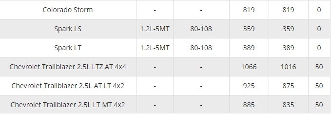Dưới đây là bảng giá xe Chevrolet cập nhật mới nhất: