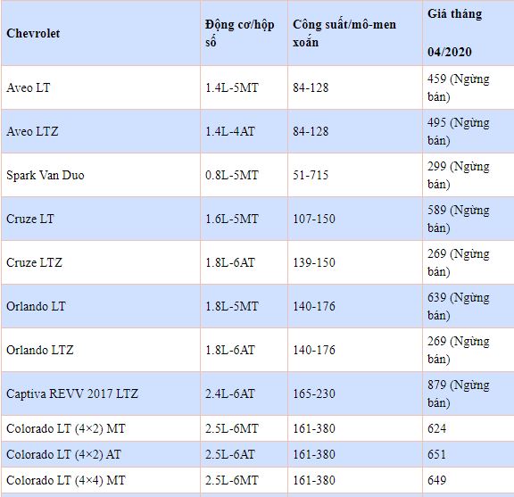 Bảng giá xe Chevrolet mới nhất tháng 4/2020 tại thị trường Việt Nam. Cập nhật thông tin giá các mẫu xe Chevrolet tháng 4/2020 nhanh và chính xác nhất.