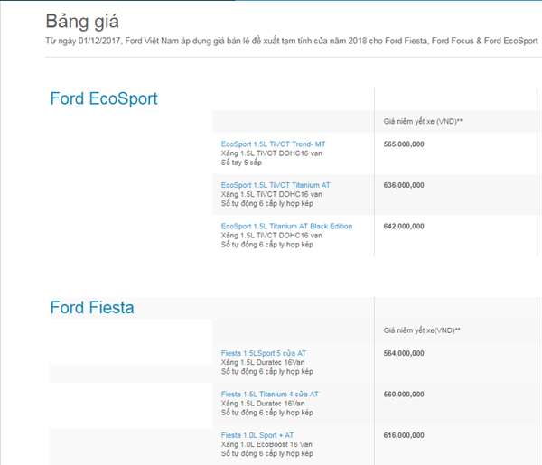 Bảng giá các dòng xe Ford mới nhất tháng 1/2018 tại thị trường Việt Nam. Cập nhật thông tin giá xe Ford tháng 1/2018 nhanh và chính xác nhất.