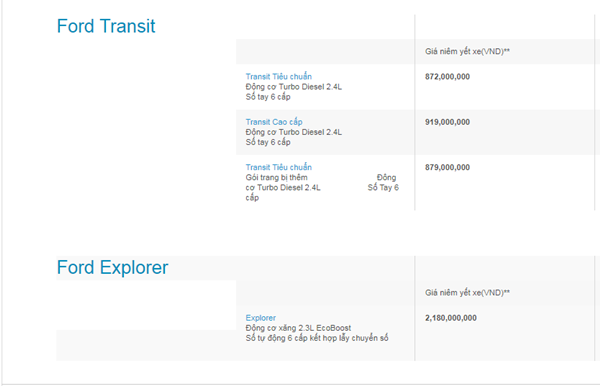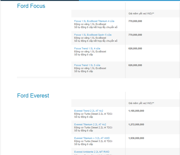 Bảng giá cụ thể các dòng xe Ford trong tháng 1 tại thị trường Việt Nam: