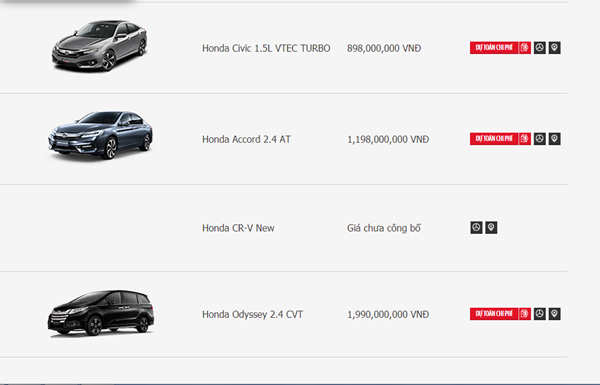 Giá bán các mẫu xe Honda công bố tại Việt Nam trong tháng 11/2017: