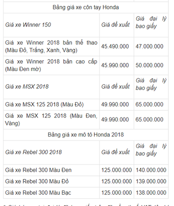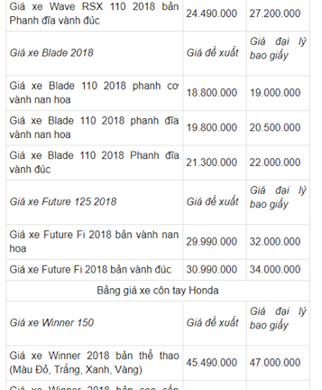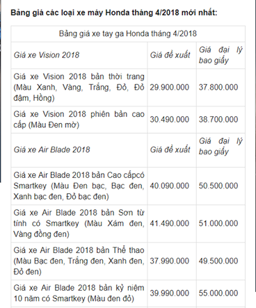 Bảng giá các mẫu xe Honda mới nhất tháng 4/2018 tại thị trường Việt Nam. Cập nhật thông tin giá xe Honda tháng 4/2018 nhanh và chính xác nhất.