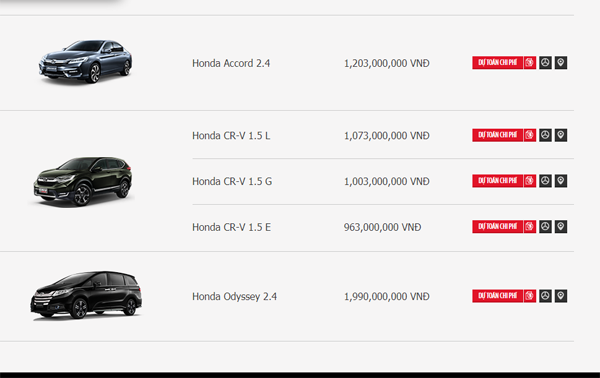 Bảng giá các dòng xe ô tô Honda tháng 6/2018. |