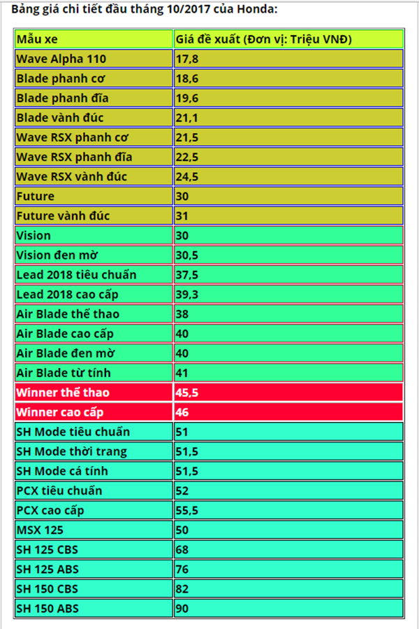Bước vào tháng 10/2017, một loạt mẫu xe số của Honda tại thị trường Việt vẫn có giá bán ra giảm nhẹ so với giá đề xuất. Giảm mạnh nhất là dòng xe số Blade với mức giảm dao động từ 0,5 triệu đồng cho tới 1,2 triệuđồng. Sau đó là Wave Alpha 110 giảm từ 0,3 - 1 triệu đồng.